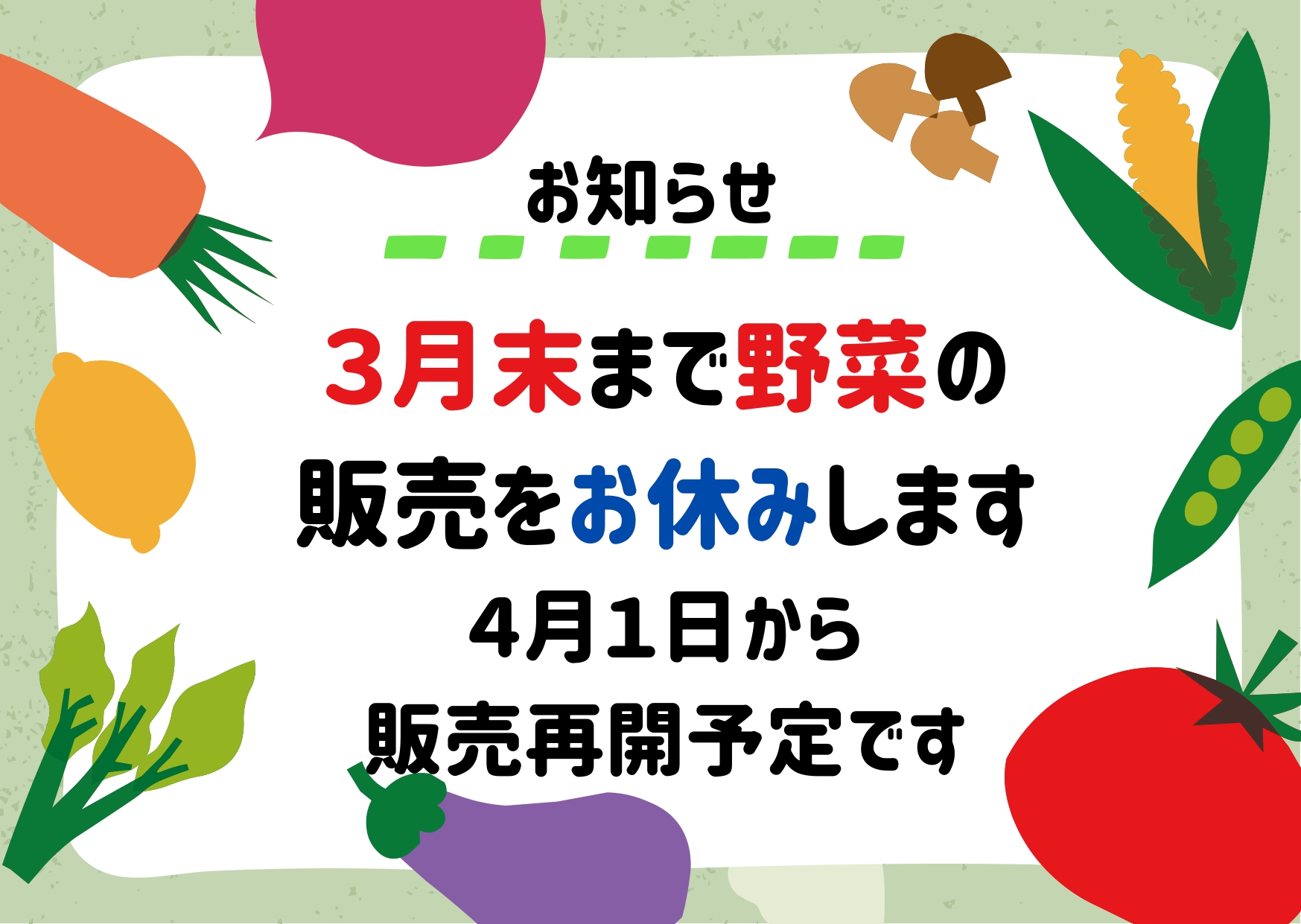 館内売店の「野菜コーナー」は、冬季期間(1月〜3月)につきお休みをいただいております。